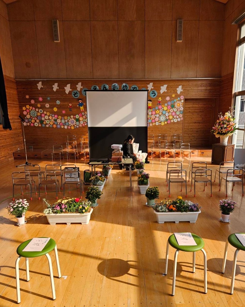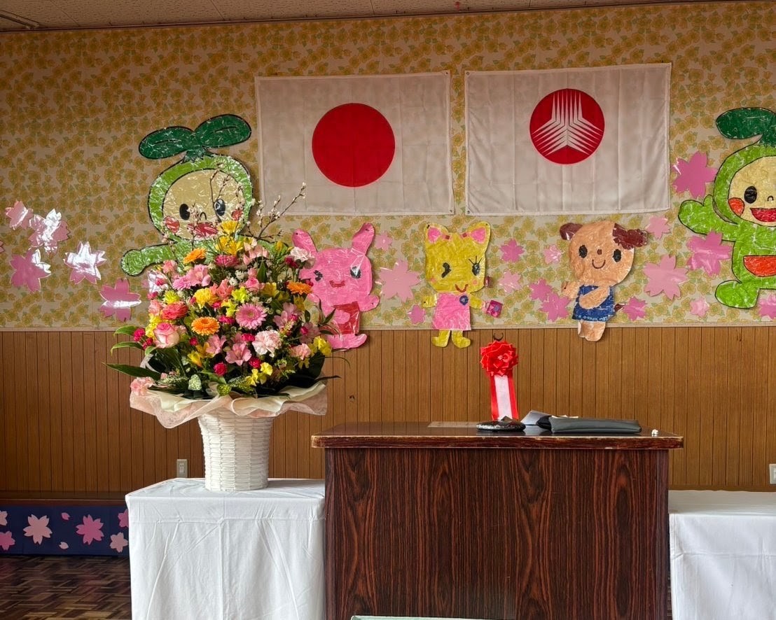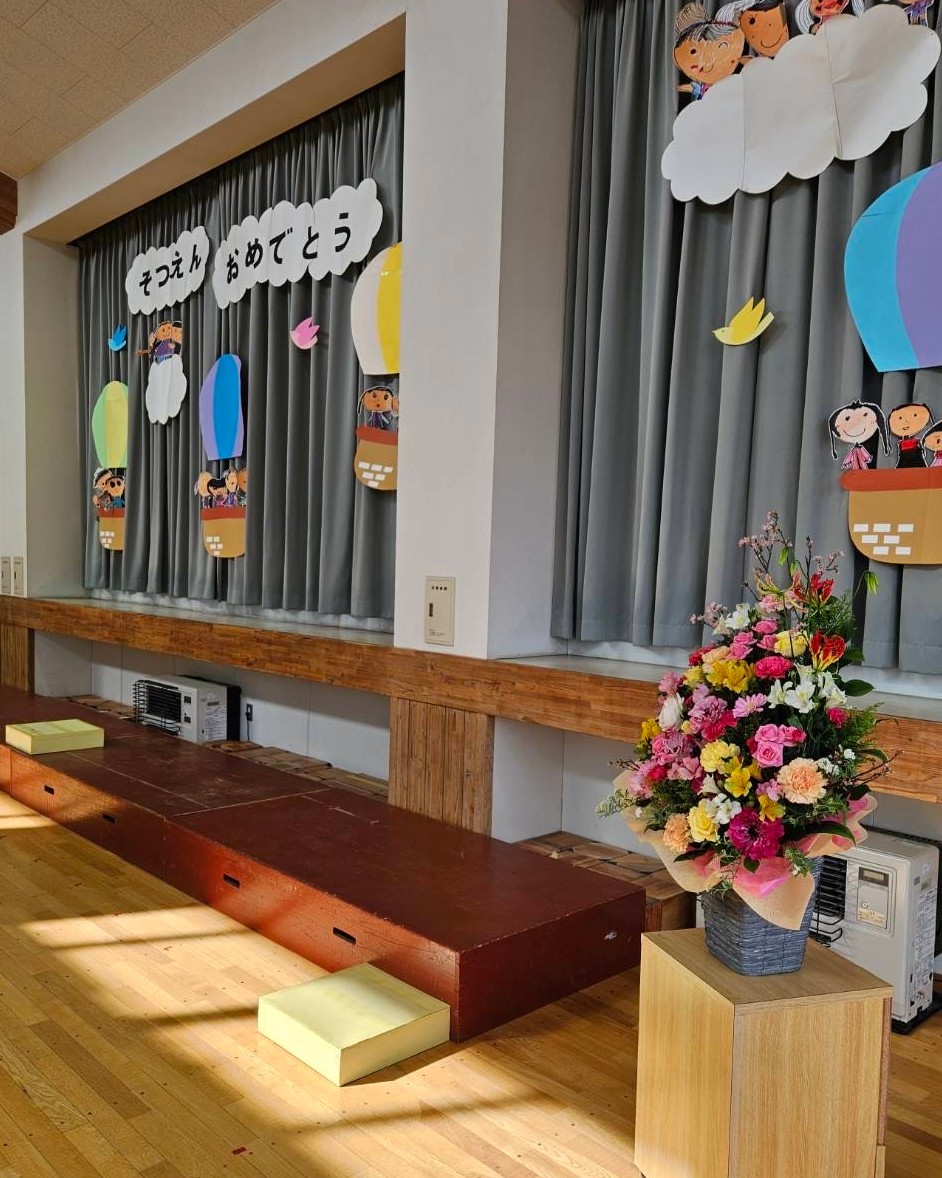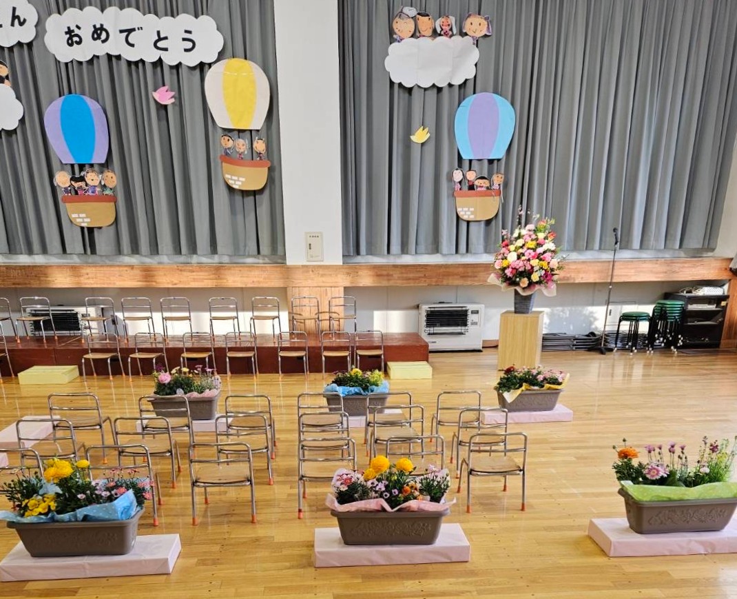 幼稚園、保育園の卒園式では少し小ぶりな演台の花をお作りしています。11,000円(税込)よりご用意可能です。