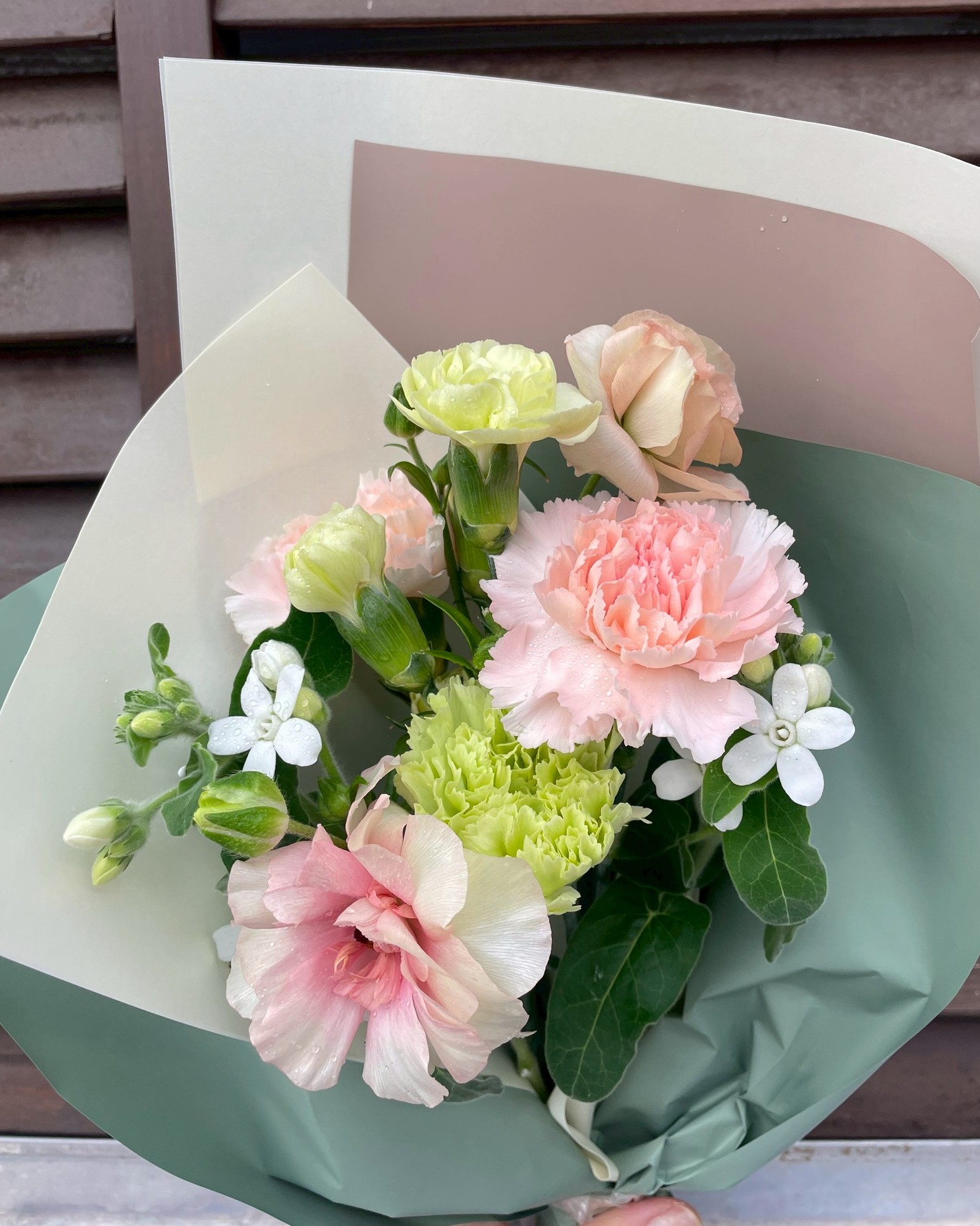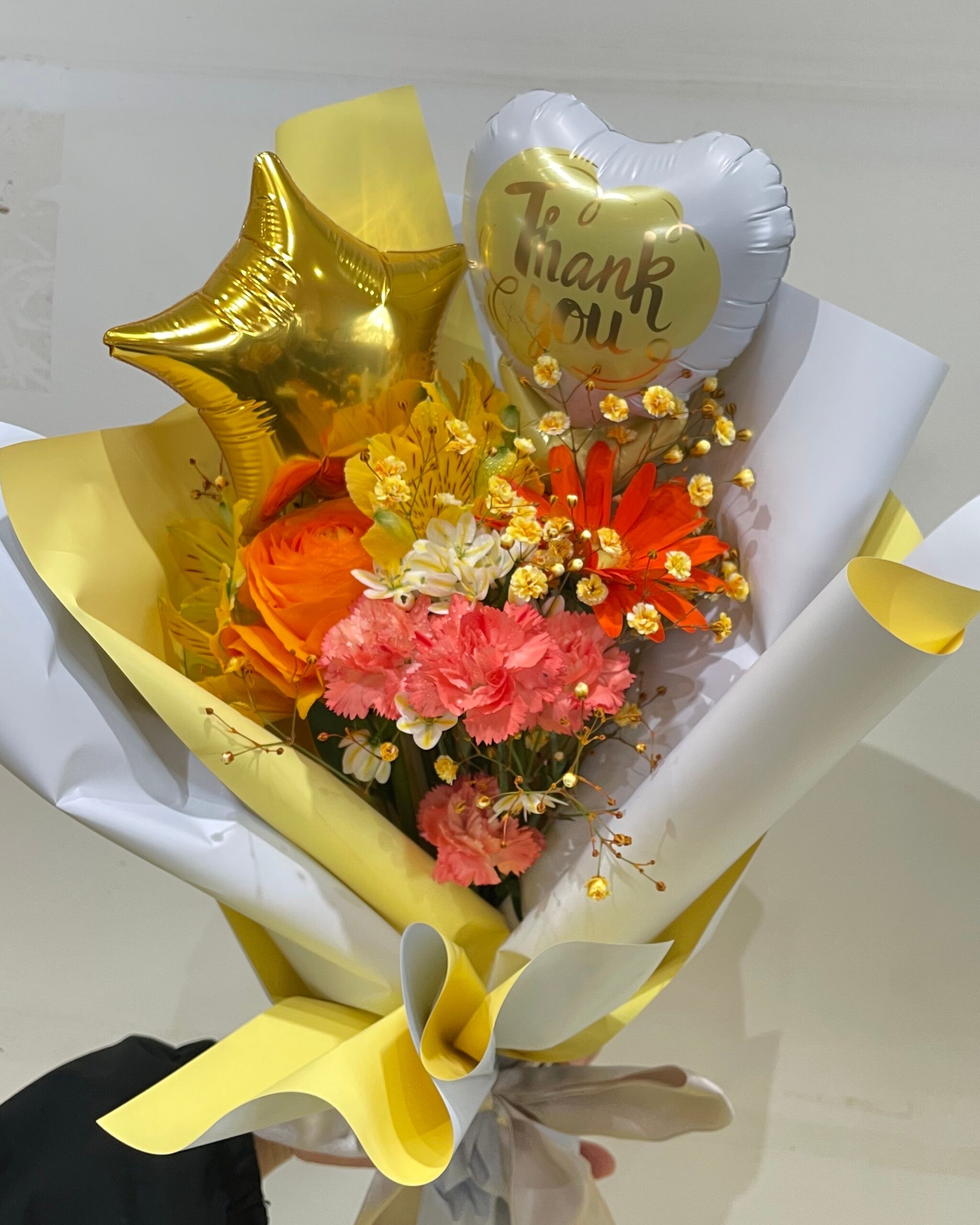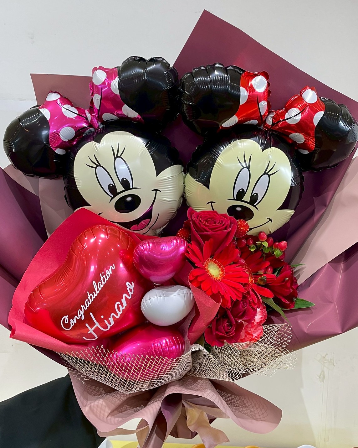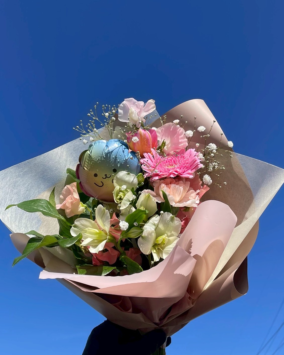 バルーンやピック、ぬいぐるみなどお持ち込みしていただき、それに合わせて花束をお作りすることも可能です!