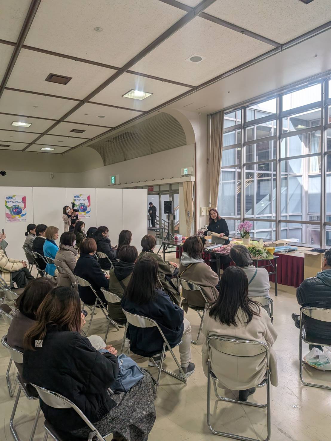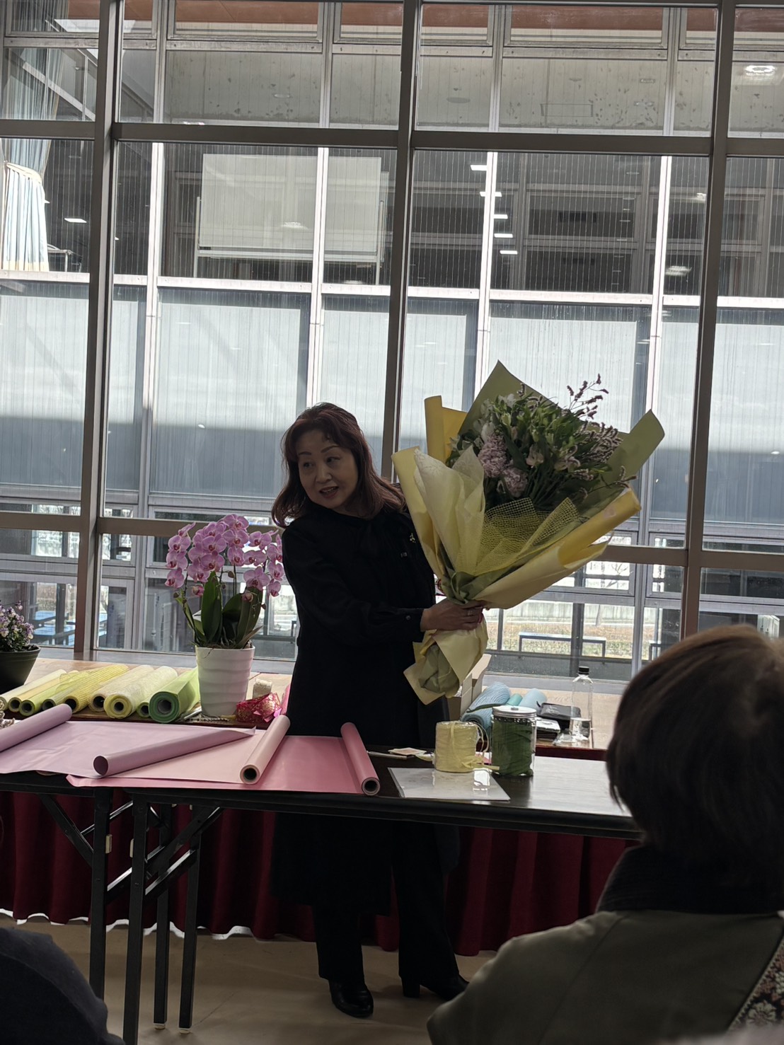 ラッピング講習会にも参加しました。数年前から話題になっている‘韓国風ラッピング’や鉢花でのリボンのアレンジの仕方などをわかりやすく解説してくださりました。